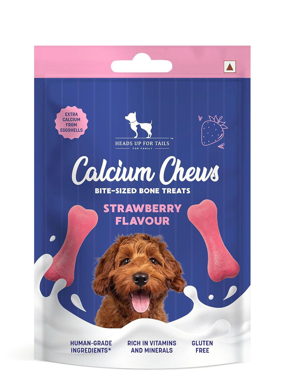 Calcium Chews to be good to the bone, and great for smiles. They are power-packed with essential vitamins and minerals, and help improve your dog's teeth and bone health-thanks to the extra calcium and phosphorus from eggshells! These strawberry-flavored treats are made of 100% human-grade ingredients. They are easy to digest, even for sensitive tummies as they are gluten-free. The soft, chewy texture also prevents tooth decay and cavities